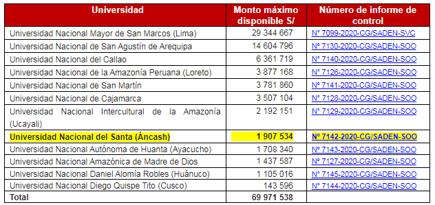 Chimbote en Línea.- La Contraloría General alertó que doce universidades públicas a nivel nacional pueden disponer de hasta de S/ 69 millones 971 mil 538 para garantizar la continuidad del servicio educativo durante la pandemia por COVID-19, sin embargo, no realizaron las modificaciones presupuestales para poder utilizar dichos recursos.