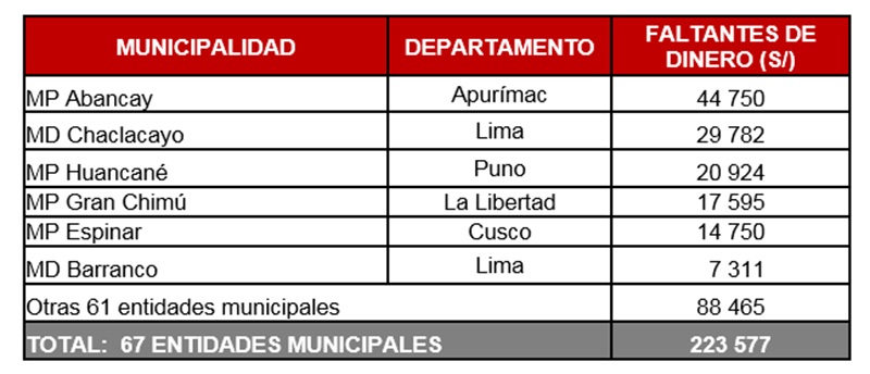 En 67 entidades municipales se identificaron montos faltantes por S/ 223,577, situación que se atribuye al uso del efectivo de funcionarios y trabajadores, así como al no haberse cumplido con depositar en las cuentas bancarias el íntegro de la recaudación directa de la municipalidad, en el plazo de 24 horas, establecido normativamente. Dicha situación observada en el 24.9% de entidades municipales visitadas, genera el riesgo de pérdida, sustracción, apropiación y/o uso indebido de los fondos municipales.