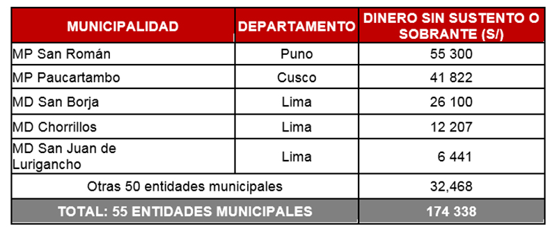En 55 entidades municipales se identificó dinero sin origen y/o fuente conocida por S/ 174,338. En general, esta situación se genera por falta de registro oportuno de los ingresos obtenidos por la municipalidad, especialmente los vinculados al comercio ambulatorio, servicios de locales deportivos y otros. Dicha situación observada en el 20.4% de las entidades municipales visitadas, ocasiona riesgos de apropiación o uso indebido de fondos municipales, sin que estos puedan ser identificados con oportunidad.