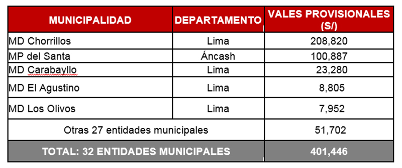 En 32 municipalidades se advirtió el uso de vales provisionales por S/ 401,446, observándose casos en los que no se contaba con las autorizaciones correspondientes. Esta situación evidenciaría el uso de los fondos municipales para fines distintos a los objetivos de la municipalidad, tales como préstamos a funcionarios y trabajadores, anticipos y adelantos de remuneraciones, entre otros. La situación observada en el 11.9% de entidades municipales visitadas genera el riesgo de utilización de fondos para fines distintos a los objetivos y metas establecidas.