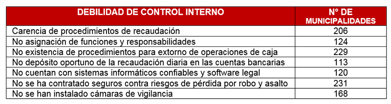Durante el operativo de control “Buen uso del efectivo en las municipalidades”, realizado en el marco del programa “Postula con la Tuya”, también se verificó si las 269 entidades visitadas habían implementado medidas de control interno relacionadas con la gestión del efectivo, identificándose los siguientes hechos: