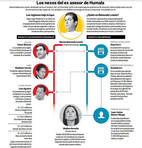 Chimbote en Línea.- El diario El Comercio publica hoy un interesante artículo en el que desenmaraña cómo funcionaba la red de corrupción del prófugo Martín Belaúnde Lossio en ciudades del interior del país y que además de millonarias licitaciones en Ancash, tuvo también grandes negocios en Cusco, Madre de Dios y Junín.