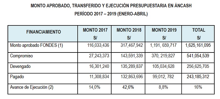 Chimbote en Línea.- En Áncash, de los S/ 1,625 millones 161 mil aprobados para las obras y servicios de construcción y reconstrucción en las zonas afectadas por el fenómeno de El Niño Costero, el Estado ejecutó el 16% que equivale a S/ 256 millones 625 mil 705 (período setiembre de 2017 a abril de 2019).