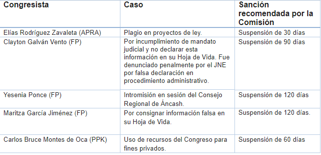 En el caso del parlamentario aprista, Elías Rodríguez Zavaleta, representante de La Libertad, quien fue investigado por plagio de proyectos de ley, la Comisión de Ética recomendó sólo una suspensión en funciones de 30 días.