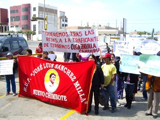 Chimbotenlinea.com (Por Juana Marchena) VIDEO .-El secretario general del asentamiento humano “José Luis Sánchez Milla”, Enrique Valle Cortés, acompañado de los moradores de la zona llegó hasta el frontis de la comisaría de Buenos Aires para exigir al comandante, Alfonso Fuentes Cancino, acelerar las investigaciones de tráfico de terrenos y proceder a denunciar por delito de estafa a Olga Zavaleta, a quien ellos sindican como responsable de ese delito.