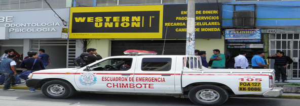 Una banda de criminales ejecutó al parecer a la perfección un plan de asalto a las instalaciones de Western Unión de la segunda cuadra del jirón Elías Aguirre en pleno centro de Chimbote, de donde sustrajeron 80 mil nuevos soles y 11 mil dólares, según se informó. (Texto y foto Lindberg Cruzado)