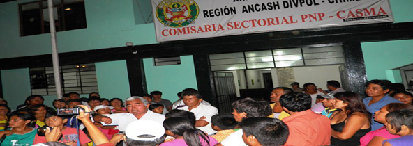Un sector de la población llegó hasta la Comisaría de Casma para reclamar justicia. Enardecidos amenazaron con bloquear un tramo de la Carretera Panamericana Norte si la policía no encuentra a los asesinos del alcalde José Alejandro Montalván Monteza de 51 años.(Texto y foto: Lindberg Cruzado-enviado especial)