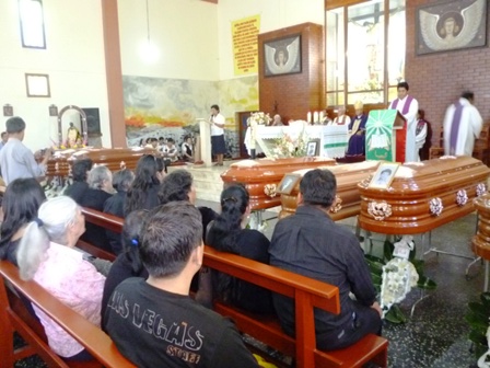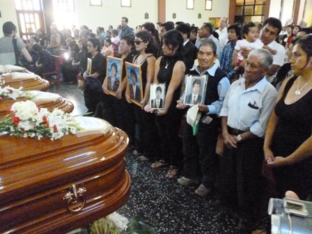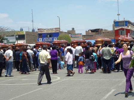 Chimbotenlinea.com (Redacción central) VIDEO.- Con los 9 ataúdes dentro del templo, conteniendo los restos de los campesinos santeños asesinados hace 19 años por el Grupo Colina, se celebró la misa de los funerales, las 11 a.m. en la parroquia Señor Crucificado de Santa.La misa fue concelebrada por el Obispo de la Diócesis de Chimbote junto a varios sacerdotes. Monseñor Ángel Simón Piorno, en su homilía, expresó su hondo pesar a los famiiares, agradeció la labor de la Comisión de Justicia Social y la presencia de Francisco Soberón, representante de la Coordinadora Nacional de Derechos Humanos, así como dos familiares de los desaparecidos de La Cantuta (Gisela Ortiz y Raida Condor).