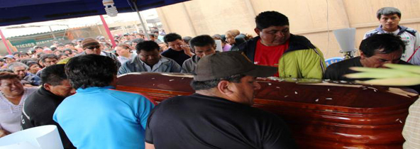 Cientos de comerciantes acompañan el velatorio de Omar Castro Zurita de 37 años, fundador del Mercado 2 de Mayo. Con lágrimas y mucha indignación reclaman justicia, que capturen a los sicarios que el domingo por la tarde mataron de 13 balazos al exdirigente.(Foto y texto Lindberg Cruzado)