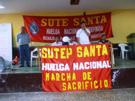 Chimbotenlinea.com (Por: Milton Palpa).- Pese a no ser escuchados en sus pedidos 40 docentes afiliados al Sindicato Único de Trabajadores de la Educación (Sute) Santa, viajarán a Lima en una marcha de sacrificio para apoyar a los maestros de todo el país, quienes llevan acatando una huelga nacional indefinida desde hace más de 20 días, exigiendo la derogación del proyecto Ley de Reforma Magisterial y otros pedidos.