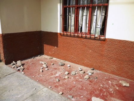 Chimbotenlinea.com (Por Cintia Cabrera).- Los hombres del andamio agremiados al sindicato de Víctor López Padilla destrozaron los vidrios de la ventana de la vivienda del ex consejero regional Ezequiel Nolasco Campos. Estos, provistos de enormes piedras, resquebrajaron algunas paredes y dañaron varias viviendas aledañas. Nolasco Campos haciendo uso de su arma de fuego realizó disparos desde el segundo nivel de su domicilio, aduciendo defensa propia y para frenar los actos de violencia, sin lograrlo.(Foto Cintia Cabrera)