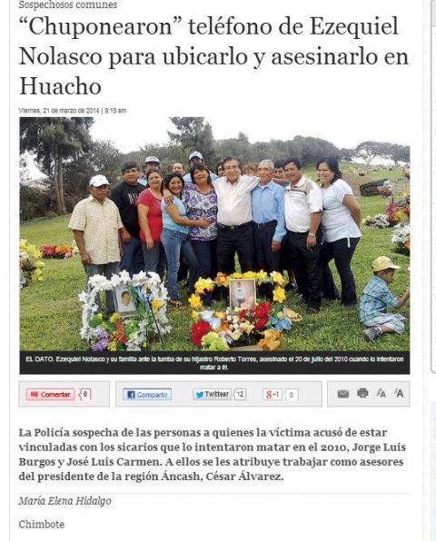 Chimbote en Línea (Informe Diario La República) Sobre el crimen del ex consejero Ezequiel Nolasco, que ha conmocionado a la región Áncash, un informe difundido hoy en el portal del Diario La República, se afirma que la Policía sospecha de las personas a quienes la víctima acusó de estar vinculadas con los sicarios que lo intentaron matar en el 2010, Jorge Luis Burgos y José Luis Carmen. A ellos se les atribuye trabajar como asesores del presidente de la región Áncash, César Álvarez. Aquí el informe de investigación de María Elena Hidalgo: