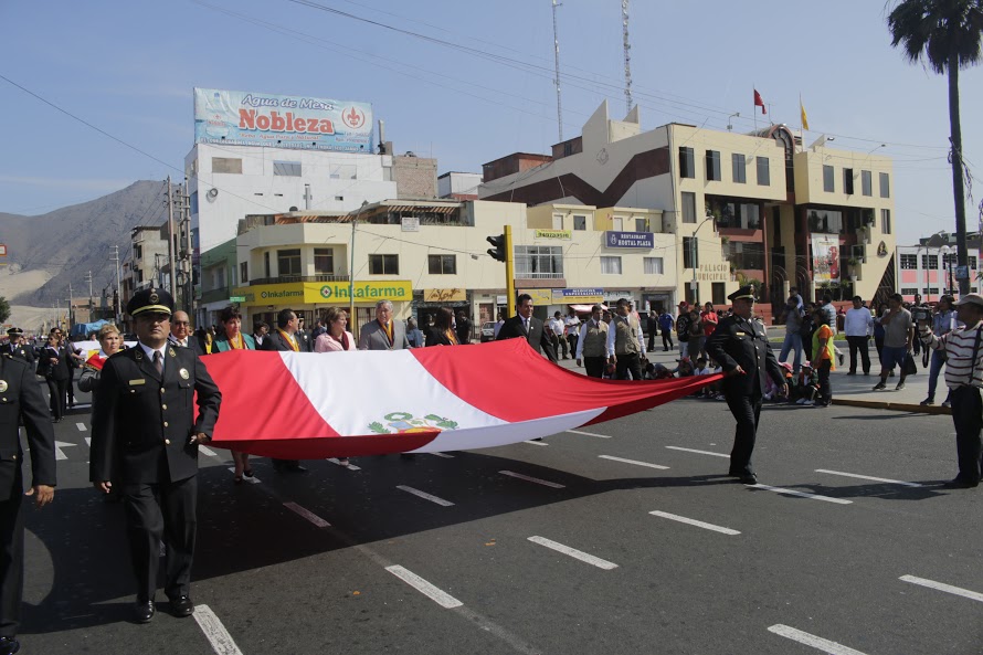 Al culminar la ceremonia religiosa, nuestras autoridades procedieron a desfilar en el Paseo de Banderas desde el frontis de la iglesia “San Pedro” hasta la plaza de banderas (ubicado frente a la plaza de armas); para luego izar el pabellón nacional, las banderas de la ciudad y la paz.