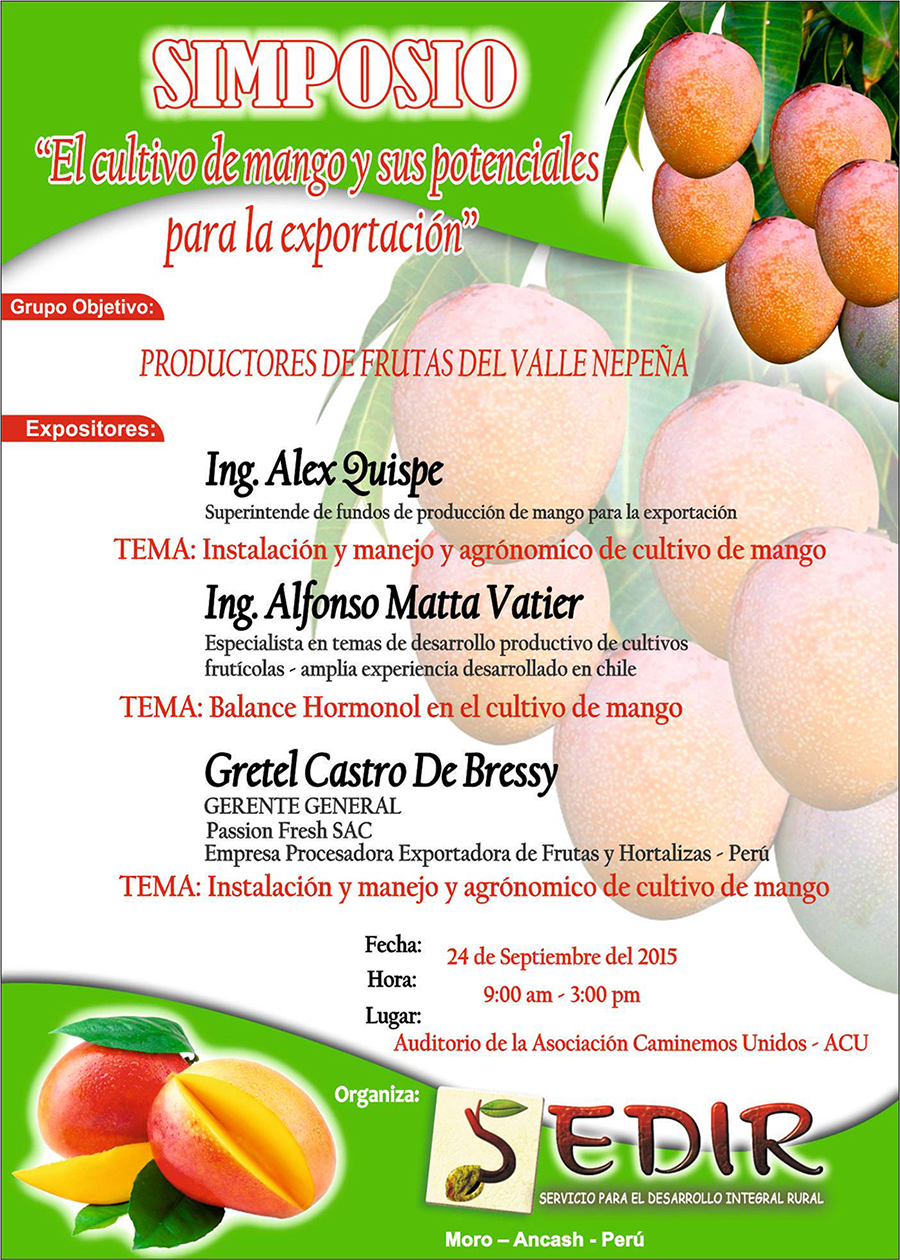 Chimbote en Línea.- Con el objetivo de contribuir al desarrollo de capacidades en los productores de mango en el distrito de Moro y el valle de Nepeña, el Servicio para el Desarrollo Integral Rural (SEDIR) realizará el simposio: “El cultivo del mango y sus potenciales para la exportación”; dirigido a los productores de mango, agricultores en general, empresarios agroexportadores y estudiantes de agronomía.