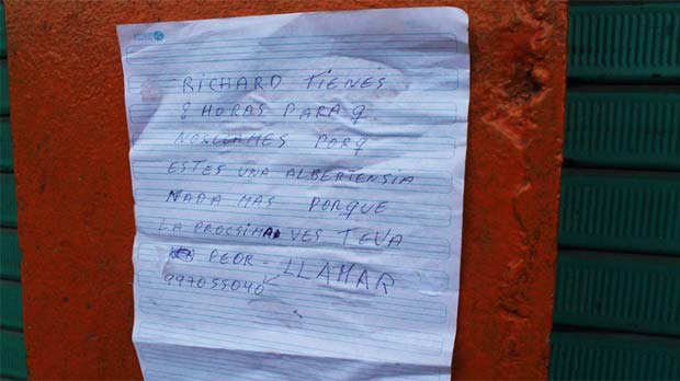 Después de consumado el hecho, los desadaptados dejaron una hoja de papel en la pared en la que decía “Richard tienes 8 horas para que nos llames porque esto es una advertencia nada más, porque la próxima vez te va peor. Llamar 997 055 040”.