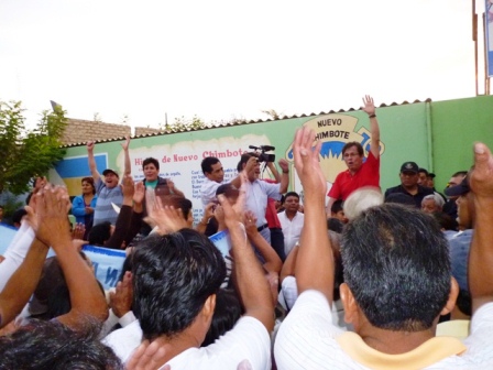 Al finalizar, el alcalde Francisco Gasco salió a agradecer a la multitud que lo espera en las afueras de la comuna de Nuevo Chimbote.