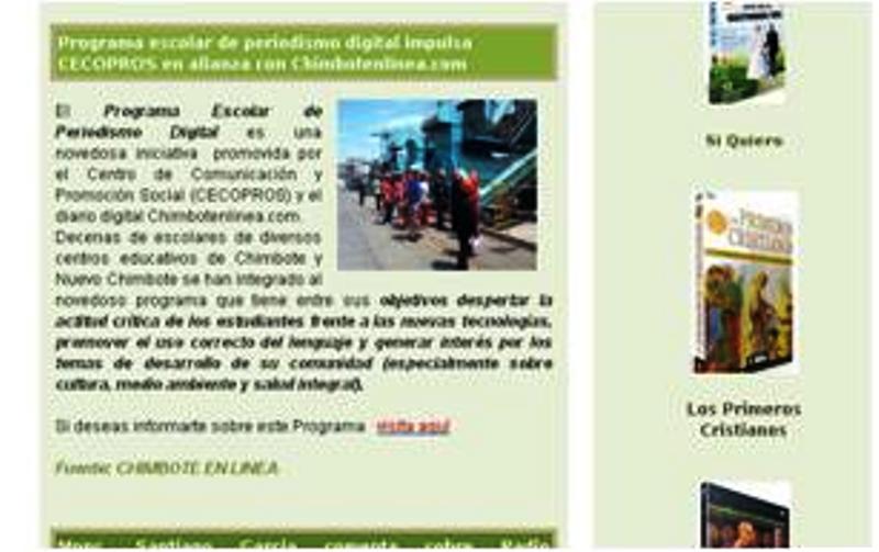 Chimbotenlinea.com (Redacción Central).- El programa de Periodismo Escolar Digital que promueve Chimbotenloinea.com y Cecopros está cosechando muchos frutos no sólo en el ámbito local, sino también en medios católicos a nivel nacional. El Boletín “Comunicándonos” de la Conferencia Episcopal Peruana ha tenido a bien concedernos un espacio para este novedoso programa, único en Chimbote y la región Ancash.