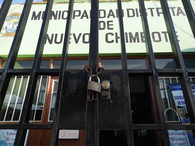 Chimbote en Línea.- Cerca de 30 trabajadores del área de vigilancia del municipio de Nuevo Chimbote colocaron cadenas a la puerta de ingreso de la comuna sureña en protesta al incumplimiento de sus salarios.