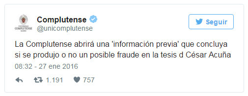 Chimbote en Línea.- La Universidad Complutense de Madrid informó hoy que abrirá una "información previa" a la tesis doctoral que presentó el candidato de Alianza para el Progreso (APP), César Acuña, a fin de determinar si hubo o no un posible fraude, tras denunciarse supuestos plagios en algunas partes de dicho documento.