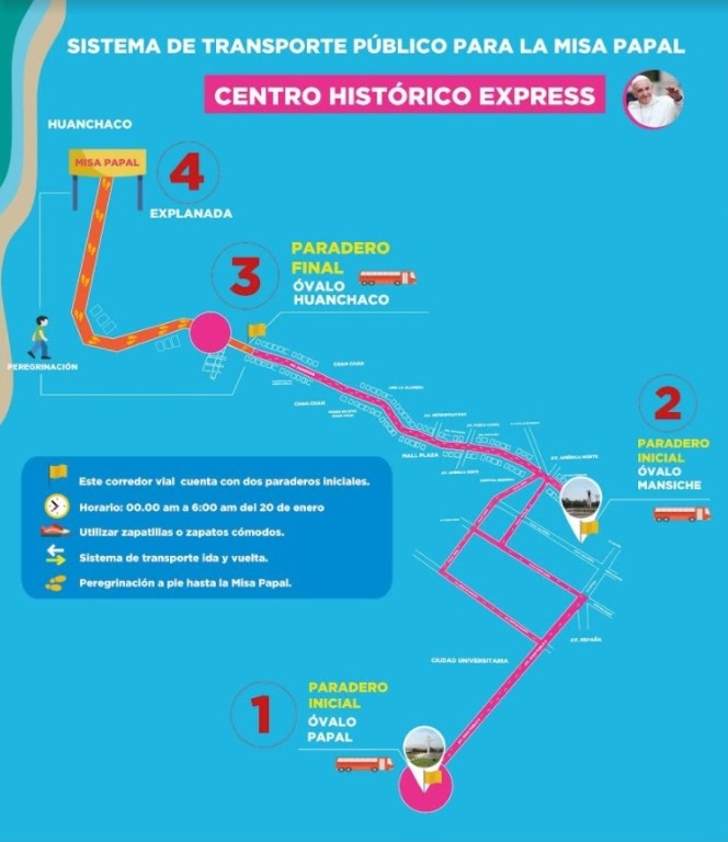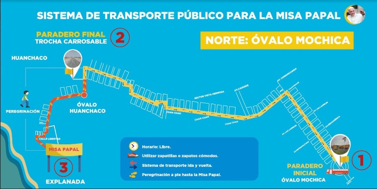 Desde el 20 de enero, antes de las 00:00 hasta las 6:00 a.m., se utilizará el corredor vía. Este sistema de transporte público partirá de dos puntos: Óvalo Papal (para las personas provenientes del Sur de la ciudad) y Óvalo Coca Cola (para las personas provenientes del centro de la ciudad). Todos ellos, incluso los que ingresarán por otra vía, provenientes del norte, llegarán sólo hasta un kilómetro antes del Óvalo Huanchaco (llamado Ovalo Papa Francisco), para luego caminar hasta la explanada.