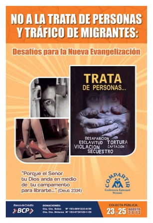 Chimbote en Línea (Cuestión de Fe).- Con el tema “No a la trata de personas y tráfico de migrantes”, este 23 y 25 de agosto se llevará a cabo en todo el país la Colecta Nacional de la Campaña de Solidaridad “Compartir” 2013, acción solidaria de la Conferencia Episcopal Peruana, que este año busca sensibilizar a la sociedad sobre la trata y el tráfico de migrantes, que son considerados una forma de esclavitud contemporánea vinculada a la explotación del ser humano.