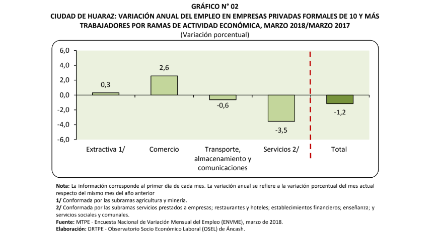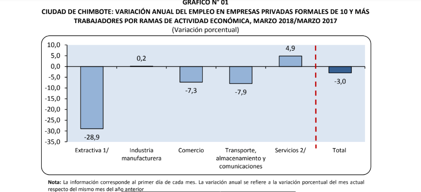 Chimbote en Línea.- El empleo en empresas privadas formales de 10 y más trabajadores en las ciudades de Chimbote y Huaraz registró una variación negativa de 3,0% y 1,2% respectivamente, en marzo de 2018, respecto del mismo mes del año anterior.