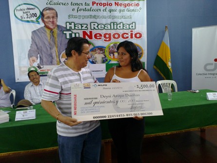 La primera en recibir su cheque -por un total de dos mil nuevos soles- fue Mery Barrantes Alva, madre de 26 años que presentó el proyecto “Jaden, Condimentos y Preparados”, una marca de molidos y productos similares sin preservantes.