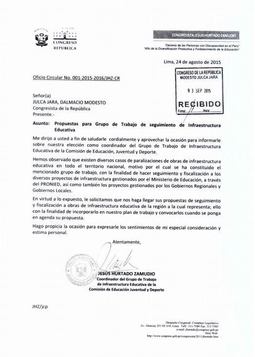 El documento está firmado por el congresista Jesús Hurtado Zamudio, coordinador del grupo de trabajo de Infraestructura Educativa de la Comisión de Educación Juventud y Deporte.