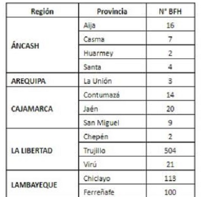 El otorgamiento de estos bonos BFH se realizará en los departamentos de La Libertad (527 bonos), Lima (332 bonos), Lambayeque (213 bonos), Piura (52 bonos), Cajamarca (43 bonos), Áncash (29 bonos) y Arequipa (3 bonos).