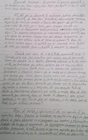 “Señor Calderón necesito un colaborador que sea capaz de declarar algunas cosas que después le explicaré, el problema es que estamos contra el tiempo señor Calderón”, señala la carta, indicando que la hora de la llamada se registró a las 10 a.m…“le contesté que me encontraba en la ciudad de Lima y que le devolvería  la llamada”, se lee.