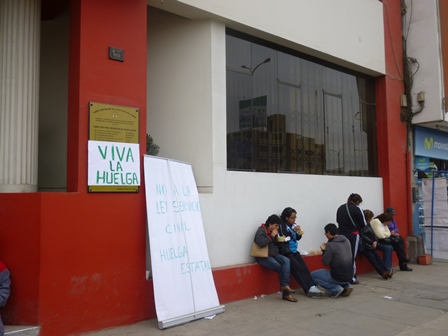 Chimbote en Línea (Judicial).- Ante el rechazo de la aprobación del Proyecto de Ley de Servicio Civil, un grupo de trabajadores de la Corte Superior de Justicia del Santa se apostó en el frontis de dicha institución y otro se sumó a la marcha por la Carretera Panamericana norte, en apoyo al paro nacional de 24 horas en contra el gobierno del presiente, Ollanta Humala Tasso.