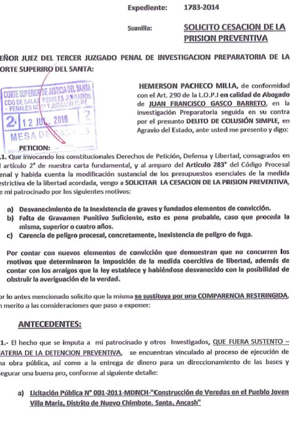 Chimbote en Línea.- Emerson Pacheco Milla, abogado del prófugo exalcalde de Nuevo Chimbote, Francisco Gasco Barreto solicitó la cesación de la prisión preventiva de 18 meses que pesa en su contra por la presunta comisión del delito de colusión simple en agravio de Estado.