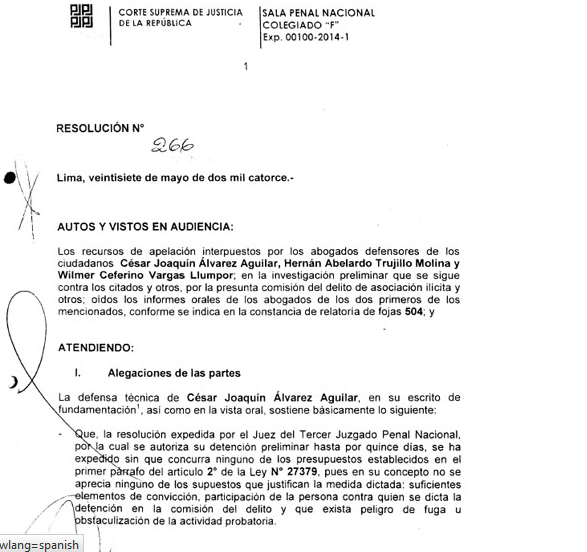 Chimbote en Línea (Judicial).- Ponemos a disposición de los lectores de Chimbote en Línea la Resolución 226 de la Sala Penal Colegiado "F", que ve el caso de César Álvarez Aguilar y otros, en el que se amplía el plazo de detención para continuar con las investigaciones a la red criminal en torno al Gobierno Regional de Áncash.(Redacción Central)