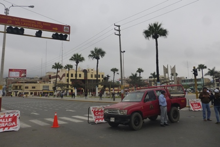 Chimbote en Línea (Locales).- Tras el anuncio del plantón de los transportistas de servicio público, la Municipalidad Provincial del Santa, no tuvo mejor idea que bloquear el acceso a la Plaza de Armas de Chimbote con la excusa de realizar el pintado de