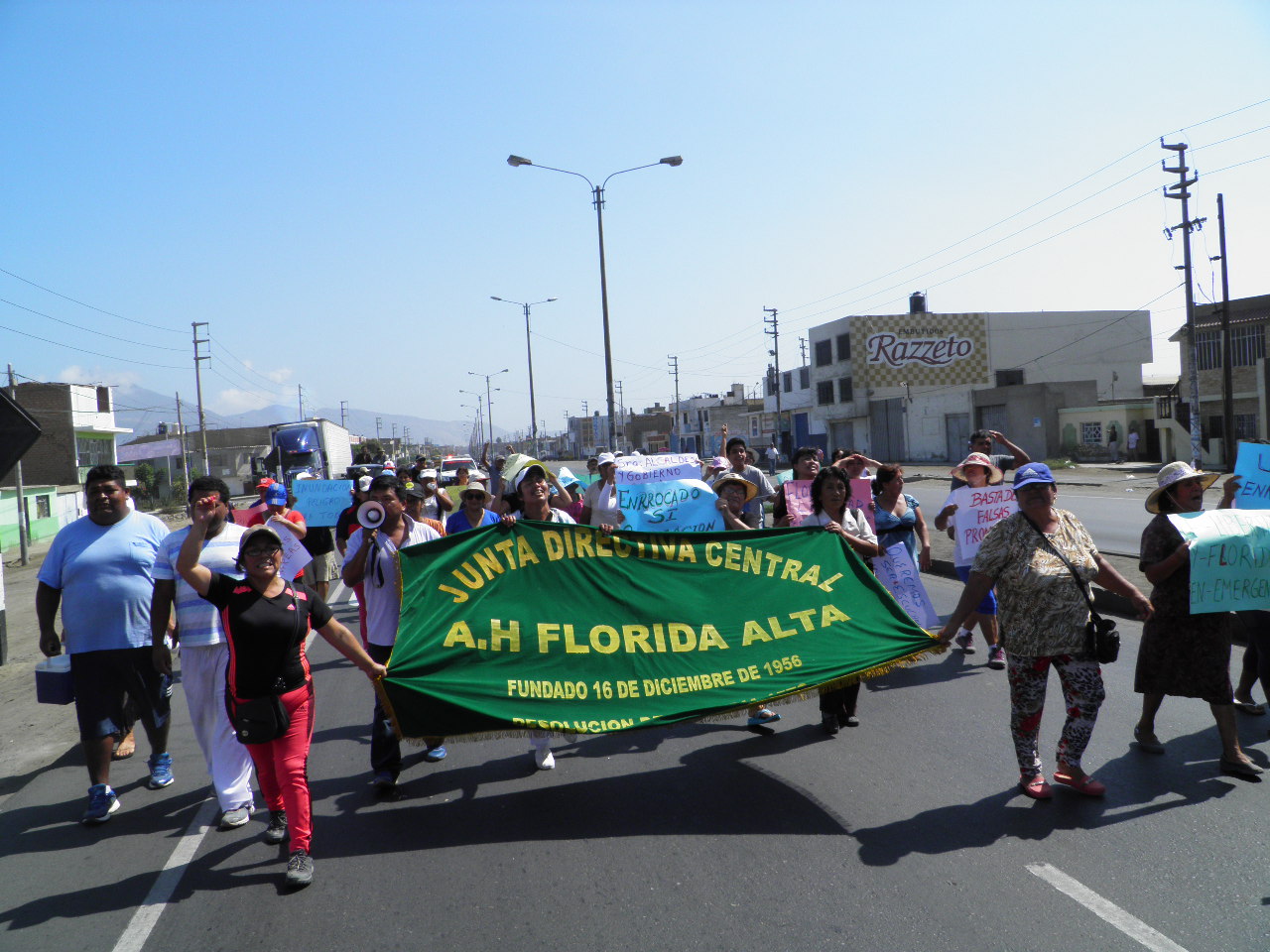 Los quejosos quienes portaban sus pancartas se desplazaron por esta principal vía para llegar hasta la urbanización La Libertad donde vive la alcaldesa de la Municipalidad del Santa, Victoria Espinoza García. Ellos se apostaron en el frontis de su vivienda donde le exigieron la ejecución del enrocado que afecta sus viviendas.