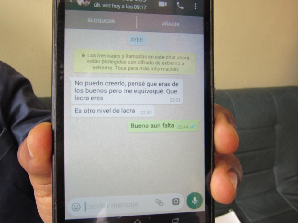Detalló que ayear, al promediar las 11 de la noche, es decir después de emitido el programa de Cuarto Poder le enviaron dos mensajes, el primero de ellos le dice: “No puedo creerlo, pensé que eras de los buenos, pero me equivoqué. “Qué lacra eres, otro nivel de lacra”. En tanto en el otro mensaje le advierten “Así no es, te vas a caer, cagón, soplón”.