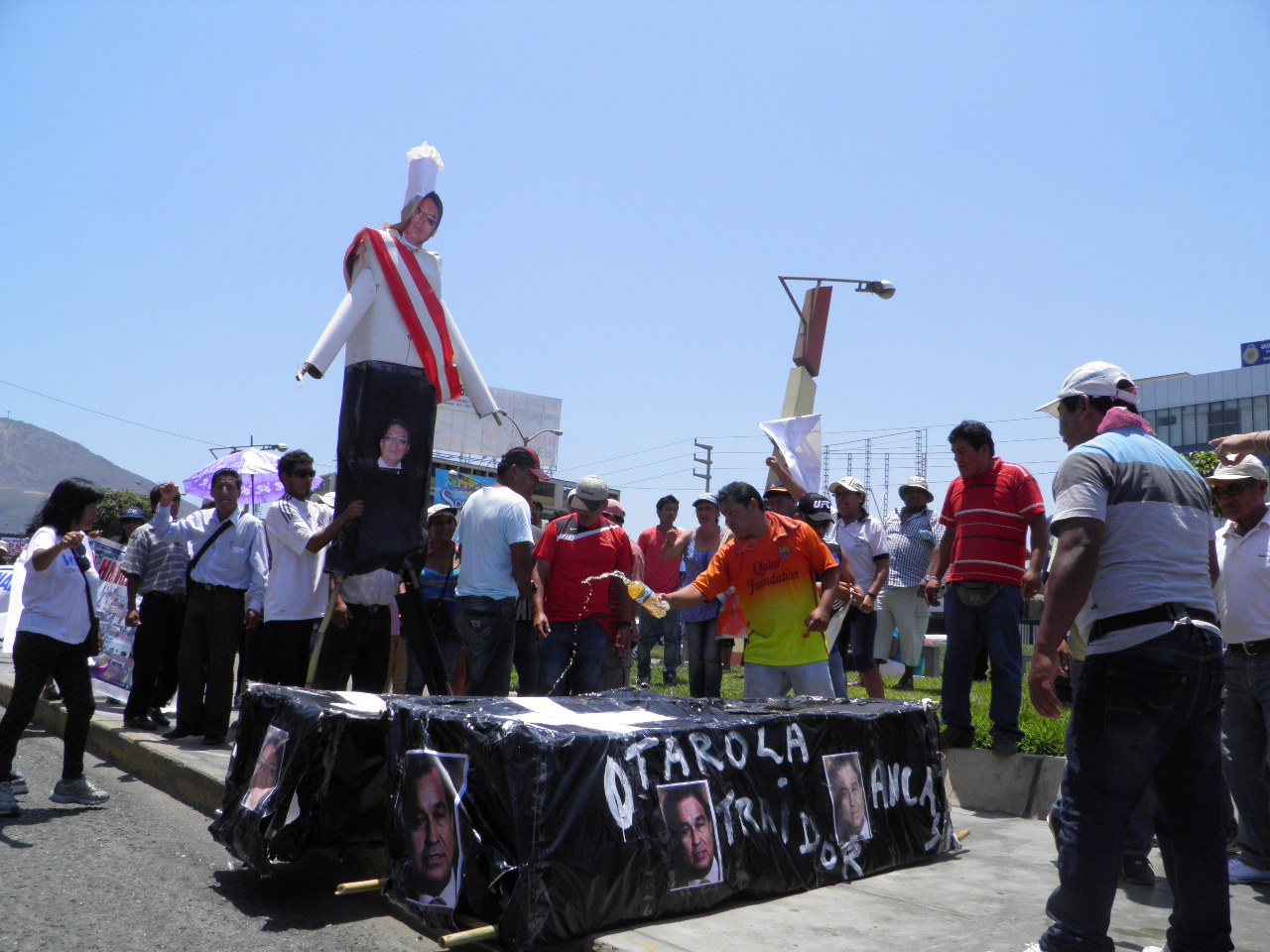 En su trayecto los quejosos invadieron la principal vía de acceso a la ciudad, interrumpiendo así el tránsito vehicular. Al término de la movilización vociferando el respaldo a Waldo Ríos quemaron los ataúdes y el muñeco de cartón en forma de cigarro con la imagen del aun presidente regional encargado, Enrique Vargas Barrenechea.