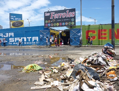 Chimbote en Línea (Locales).- La basura, el comercio ambulatorio y los paraderos informales de vehículos, se han convertido en dolor de cabeza para la mayoría de comerciantes y clientes del populoso centro comercial Los Ferroles de Chimbote, quienes se han visto expuestos a olores nauseabundos y a la cantidad de moscas que provienen del basurero ubicado en la entrada principal de este centro.