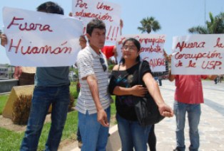 Chimbote en línea (Locales).- Luego de que el rector de la Universidad San Pedro (USP), José María Huamán Ruiz, fuese reelegido esta mañana para permanecer en el cargo por 5 años más, un grupo de estudiantes de la Facultad de Medicina se apostó en la Plaza de Armas con jeringas en mano para desangrarse entre ellos y luego escribir en carteles frases contra la reelección de la autoridad universitaria.