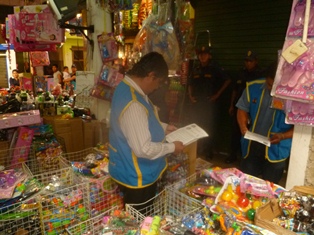 Chimbote en Línea (Locales).-La Segunda Fiscalía de Prevención del Delito, Discamec, Policía Nacional del Perú y la Gerencia de Servicios Públicos de la Municipalidad Provincial del Santa, a través de la División de Comercialización, realizaron un operativo incautando más de 60 juguetes de dudosa procedencia.