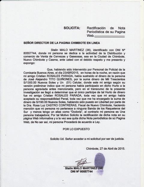 Chimbote en Línea.- Tras ser intervenido hace algunos días por efectivos de la comisaría de Buenos Aires, Stalin Malo Martínez, acusado de estar involucrado en un robo de dinero, rechazó las acusaciones señalando que no pertenece a la "Banda de los Raqueteros del Sur", como lo había mencionado la Policía.