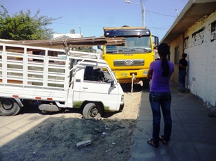 Esta tarde, una familia quien realizaba su mudanza tuvo problemas con el camión que transportaba sus enseres debido a que una de sus llantas cayó en un hueco. Según precisó uno de las vecinas, aquel orificio fue hecho la semana pasada cuando el alcalde Francisco Gasco Barreto acudió a colocar la primera piedra de la obra y se olvidaron de tapar esta superficie que resulta perjudicial para los habitantes.