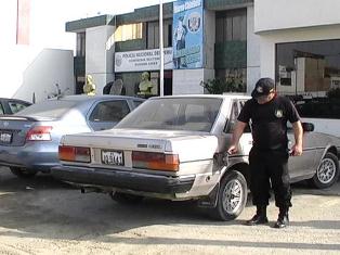 Wilber Velásquez Álvarez (24) fue sorprendido por serenazgo cuando se percataron que estaba parado al costado del vehículo de placa JQ-9441, que tenía una de las lunas laterales, rota. Según dijo el facineroso porque había olvidado las llaves del vehículo dentro.
