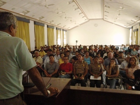 Chimbotenlinea.com (Por Cintia Cabrera).- Ronderos vecinales, agentes de serenazgo y secretarios generales de diferentes pueblos participaron de la charla de seguridad ciudadana dictada por Elidio Espinoza Quispe, asesor de seguridad de la comuna distrital. El evento tuvo la finalidad de integrar al pueblo con sus autoridades en el esfuerzo de combatir la delincuencia.(Foto Cintia Cabrera)
