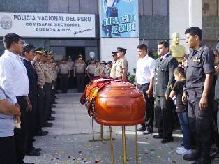 En representación del comisario del distrito de Nuevo Chimbote, el mayor PNP Jimmy Farro Medina se encargó de darle el último adiós, quien prestó labores en la comisaría Buenos Aires hace un año y medio desde que egresó de la Escuela Técnica.