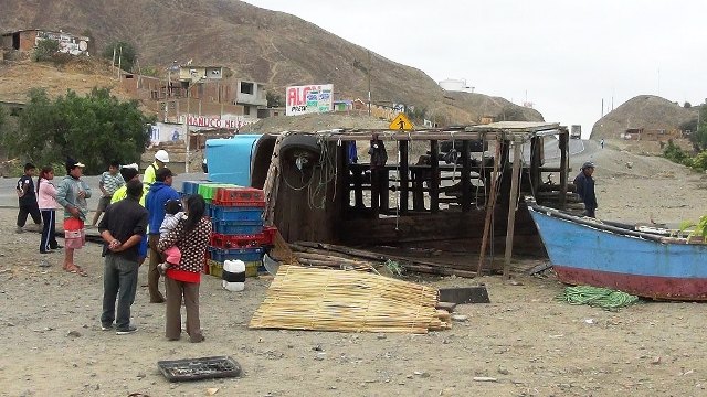 Los 12 heridos fueron evacuados de emergencia al Hospital La Caleta, mientras que en la zona del accidente quedaron esparcidas las cubetas de pescado y el camión volteado. (Redacción Central)
