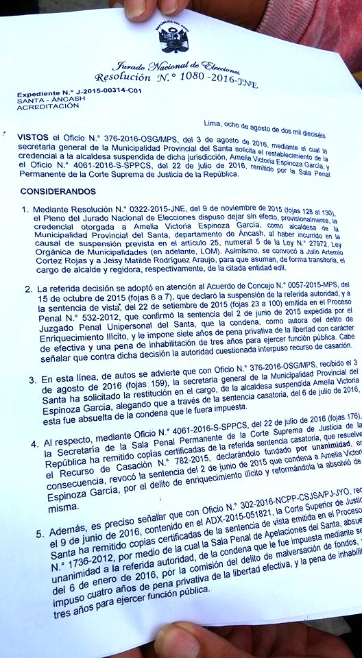 La referida resolución dispone en su artículo primero dejar sin efecto la credencial otorgada a Julio Artemio Cortez Rojas, teniente alcalde quien asumió el despacho edil de la provincia del Santa, luego de que el Poder Judicial en segunda instancia sentenció a Victoria Espinoza y a su ex conviviente Willmer Agapito, a siete años de prisión, por el delito de enriquecimiento ilícito, por lo cual la alcaldesa decidió entrar en la clandestinidad.