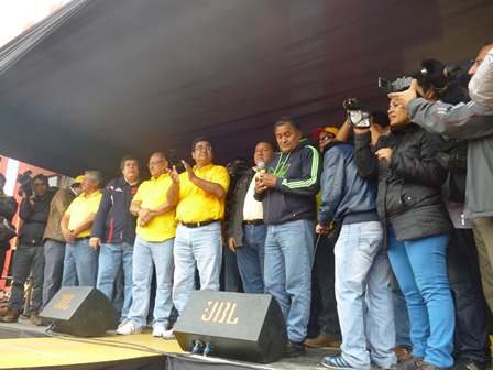 Luego de haber recorrido por varias horas los allegados al gobierno regional de turno se apostaron en la Plaza de Armas cargando en sus hombros a sus “dignos” representantes de la región Ancash, como Álvarez Aguilar, Luis Arroyo Rojas y el congresista comando, Heriberto Benítez.